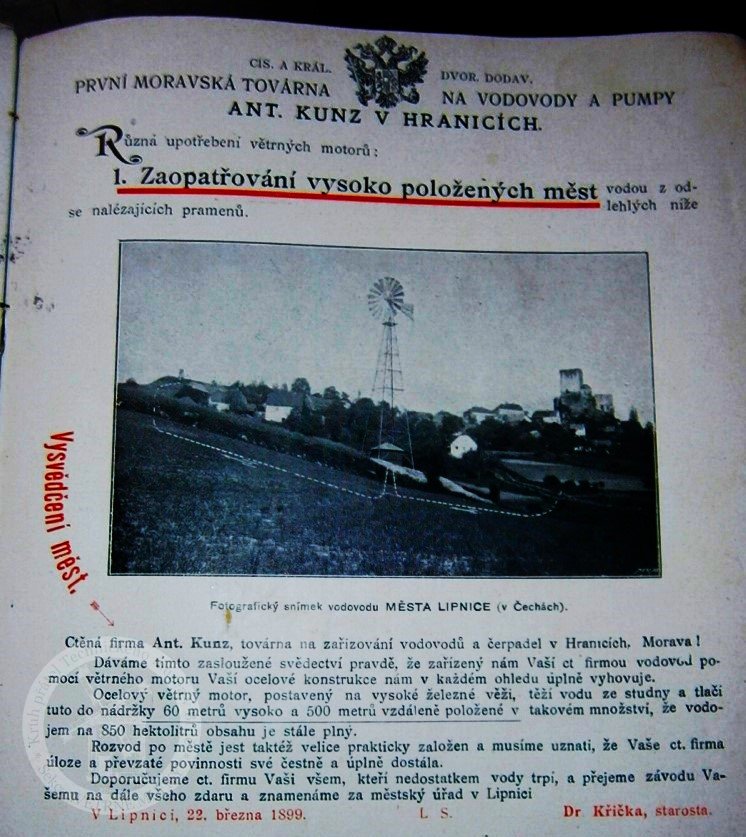 Pohlednice z r. 1903 je unikátní zakreslením trasy mezi zdrojem vody, větrným čerpadlem a vodojemem. V katalogu firmy KUNZ je údaj o vzdálenosti vodojemu od větrného čerpadla 500 m s výškovým rozdílem + 60 m a objemem 850 hektolitrů (85 m3).