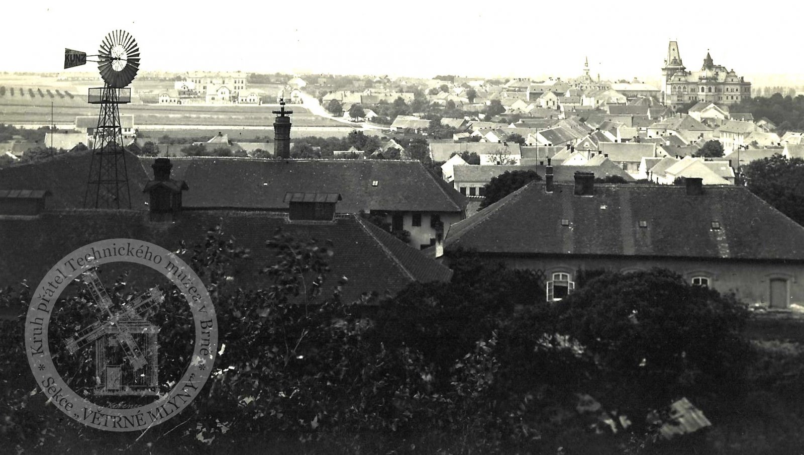 Větrné čerpadlo nad vlastní studnou na příhradovém stožáru s rotorem typu Eclipse, výrobce KUNZ, dodávalo vodu pro pivovar