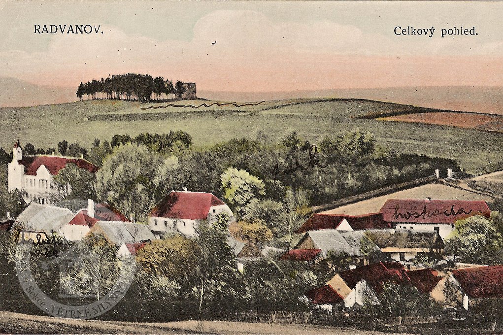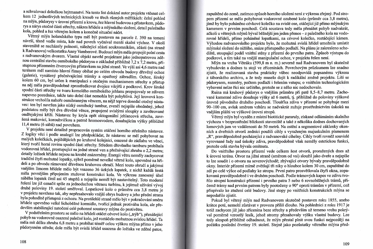 (308) GÚ – ČSAV, VM – Č, čj. 126/58, sdělení OÚGK – OMS ve Voticích z 3.4. 1958. Zpráva rady MNV v Radvanově uvádí, že zbytky větrného mlýna jsou na pozemkové parcele č. 385. Podle katastrální mapy byla pozemková parcela č. 382 roku 1830 rolí a sousední, malá pozemková parcela č. 385, pustinou. Stejnou situaci zobrazuje i katastrální mapa z r. 1908 (GÚ – ÚAGK, SK, OM, i.č. 6410, 1908). Na obou mapách je na pozemkové parcele č. 385 vyznačen výškový bod, ale nikoli zbytky stavby větrného mlýna.