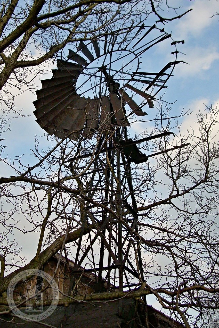 Větrná turbína je značně poškozena. Chybí několik lopatek a většina dalších je silně poškozeno. Chybí obvyklý plechový kryt nad ozubenými převodovými koly. Jednotlivá táhla a upínací spojky mezi lopatkami jsou silně zasaženy rzí, některé (nebo spíše všechny) je třeba vyměnit.