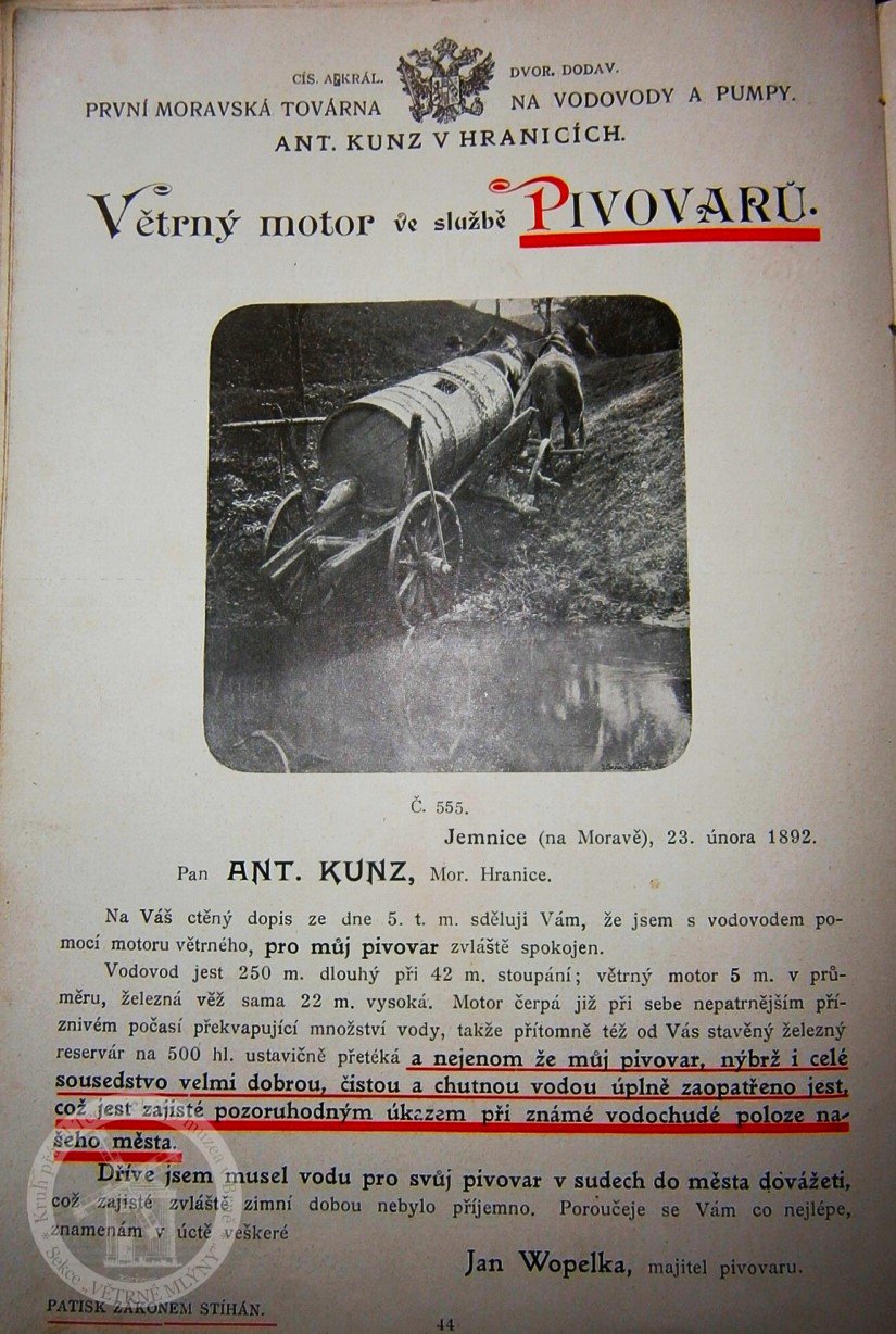 Větrné čerpadlo pro zásobování zámeckého pivovaru a okolních domů vodou na vzdálenost 250 m, s výtlakem 42 m. Příhradový stožár, výška 22 m.