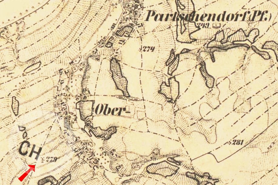 Větrný mlýn beraní, asi 200 m od středu obce mezi polními cestami k Zámečku (Schössel), kóta 315. Roku 1875 byl v provozu. Zanikl asi poč. 20. stol.